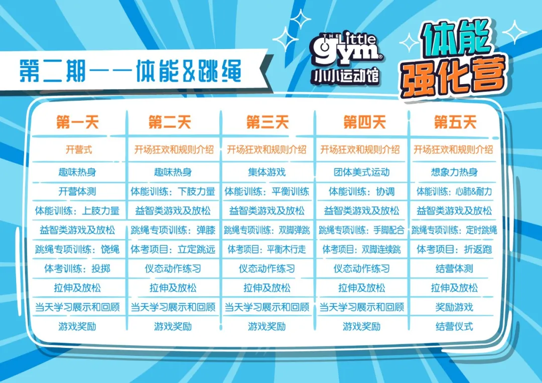 体能强化营每期5次,每次2个小时,具体时间是每周的周一-周五。